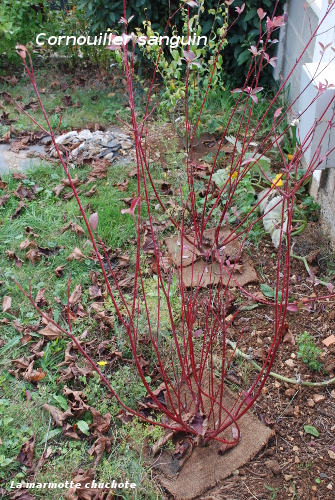 - Cornouiller sanguin (Cornus Alba ‘Sibirica’) : j’ai choisi cet arbuste pour son bois rouge en hiver.