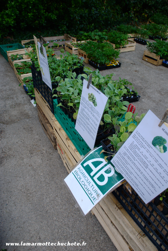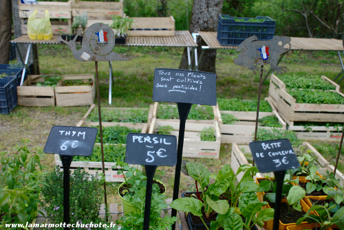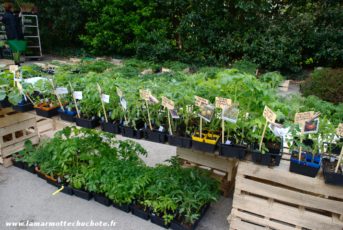 Maintenant que j’ai presque tous les légumes du soleil que je désire pour cette année, je pars flâner sur les autres stands pour mes derniers achats. Je furète à la recherche d’aromatiques ou de plantes vivaces dont j’ai besoin. Chez les pépinières Rassinoux, je rachète un plant de sauge (le mien n’ayant pas résisté à l’hiver), du fenugrec dont j’apprécie la saveur. Leur collection d’aromatiques est impressionnante mais je dis non au thym à l’odeur d’orange. Pour finir, je prends un plant de consoude pour faire des purins.