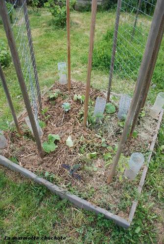 Puis j’ai commencé à installer mes plants : tomates, concombres, cornichons, aubergines, poivrons, courgettes en prenant soin de faire les bonnes associations et de prendre en considération les besoins en eau. A la base des tuteurs des tomates, des concombres et des cornichons, j’ai semé des haricots grimpants violets. J’ai laissé aussi les plants qui ont poussé spontanément : souci, tournesol, arroche. Et enfin j’ai planté autour de ces légumes d’été un basilic cannelle et des choux. Dans cette belle association, il manque les tagètes qui n’ont poussé spontanément. Pour finir, j’ai refait des semis de fleurs en pleine terre et en godets ainsi que des plantes aromatiques.