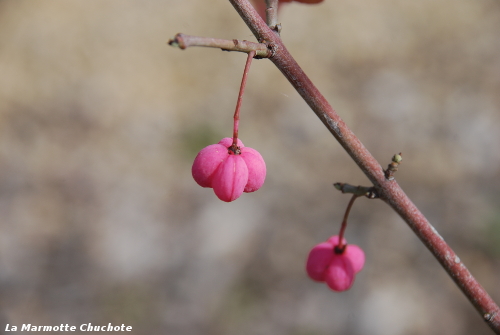 Ces fleurs rose m’ont intriguées. D’ailleurs au début je pensais que c’étaient des baies! Maintenant je connais le nom de cet arbuste : le fusain. Merci Résé et bonne journée.