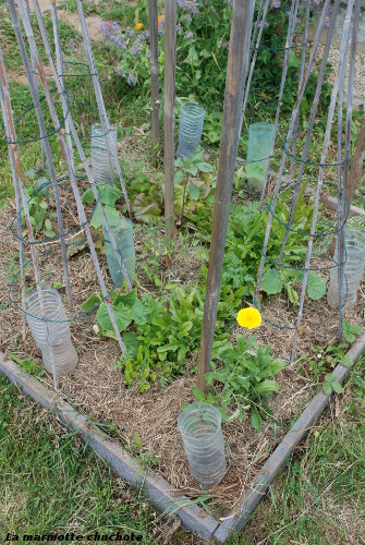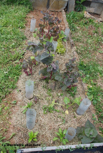 Puis j’ai commencé à installer mes plants : tomates, concombres, cornichons, aubergines, poivrons, courgettes en prenant soin de faire les bonnes associations et de prendre en considération les besoins en eau. A la base des tuteurs des tomates, des concombres et des cornichons, j’ai semé des haricots grimpants violets. J’ai laissé aussi les plants qui ont poussé spontanément : souci, tournesol, arroche. Et enfin j’ai planté autour de ces légumes d’été un basilic cannelle et des choux. Dans cette belle association, il manque les tagètes qui n’ont poussé spontanément. Pour finir, j’ai refait des semis de fleurs en pleine terre et en godets ainsi que des plantes aromatiques.