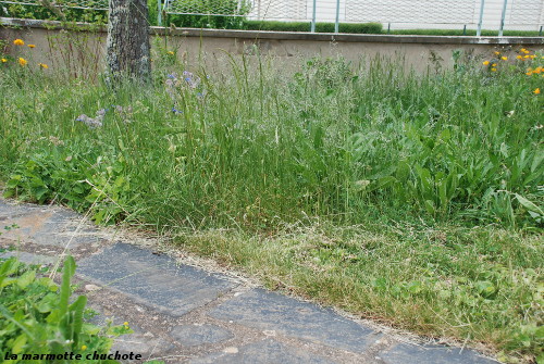 Tout d’abord, j’ai passé la tondeuse pour avoir du paillis pour le jardin et ainsi limiter les arrosages et l’évaporation de l’eau. Je n’avais pas tondu depuis octobre ou novembre dernier alors l’herbe était assez haute. J’ai tondu juste la surface de pelouse nécessaire au paillage du potager. Il reste encore dans mon jardin une grande partie d’herbes folles à travers lesquelles j’ai aménagé des circulations. Et dire que mes voisins ont déjà tondu leur pelouse 3 ou 4 fois.