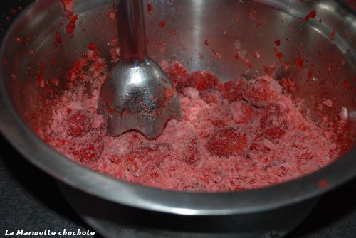 - Réduire en purée les fraises congelées avec le mixeur ou le blender. Si vous utilisez un mixeur à pied, vous pouvez recouvrir le récipients contenant des fraises avec un torchon. Ne pas mixer en continu pour ne pas que les fruits décongèlent.