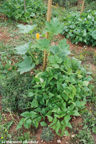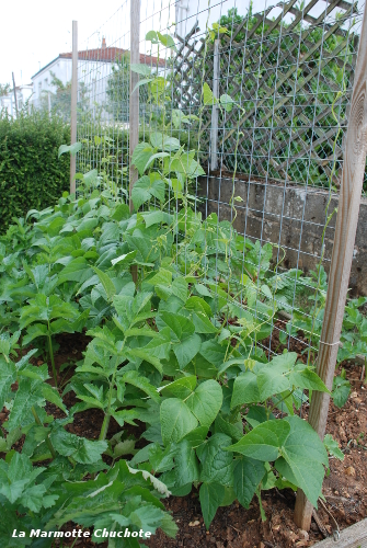 Pour le reste du potager, les haricots se portent bien. J’ai semé pour la première fois des haricots à rames (haricots grimpants qu’il faut tuteurer). Les haricots violets commencent à se former (qui deviennent verts à la cuisson). Les haricots flageolets rouges et les haricots noirs à écosser sont en fleurs. Avec ces derniers, j’ai aussi semé différentes courges que je fais grimper sur des tuteurs. L’idéal aurait été d’ajouter du maïs pour former une milpa.