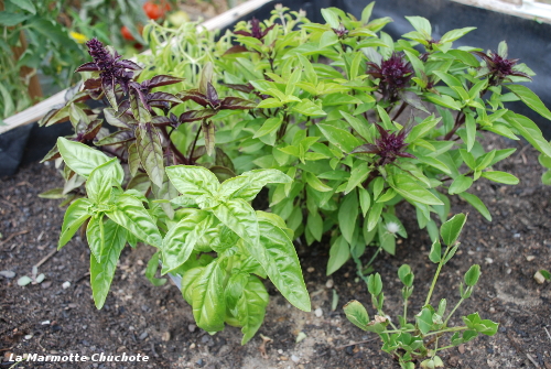 Pour les aromatiques, j’ai opté pour des semis et des plants achetés chez mes maraîchers. J’ai de très beaux basilics et de belles pousses de moutarde, bien piquantes. Là aussi, quelques échecs : les graines de carvi, périlla et cumin noir n’ont pas poussé.