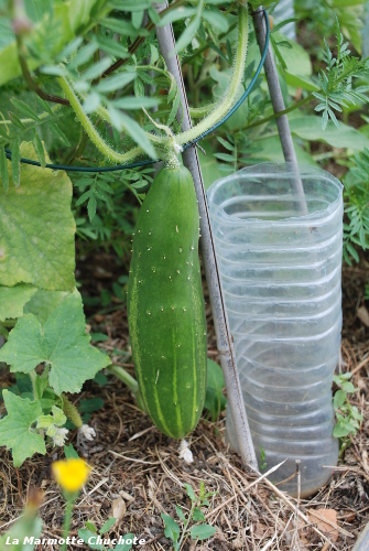 Ainsi, j’ai laissé pousser les semis spontanés (coriandre, tagètes, tournesols, soucis, capucines …) puis j’ai planté des concombres, courgettes, poivrons, aubergines … J’ai deux carrés potager qui ressemblent à deux petites jungles. A part deux pieds de concombres morts, les autres plantes ne se portent pas trop mal. Mais l’alternance des fortes chaleurs et de pluie à favoriser l’oïdium. Je traite donc avec un mélange de bicarbonate de soude (1 cuillère à café), de savon (1 cuillère à soupe) dans un litre d’eau. Cette potion doit stopper la progression du champignon. Je traite une fois par semaine ou après chaque pluie. Un apport assez conséquent d’engrais m’a permis cette année aussi d’avoir de plus beaux légumes dont un joli concombre.